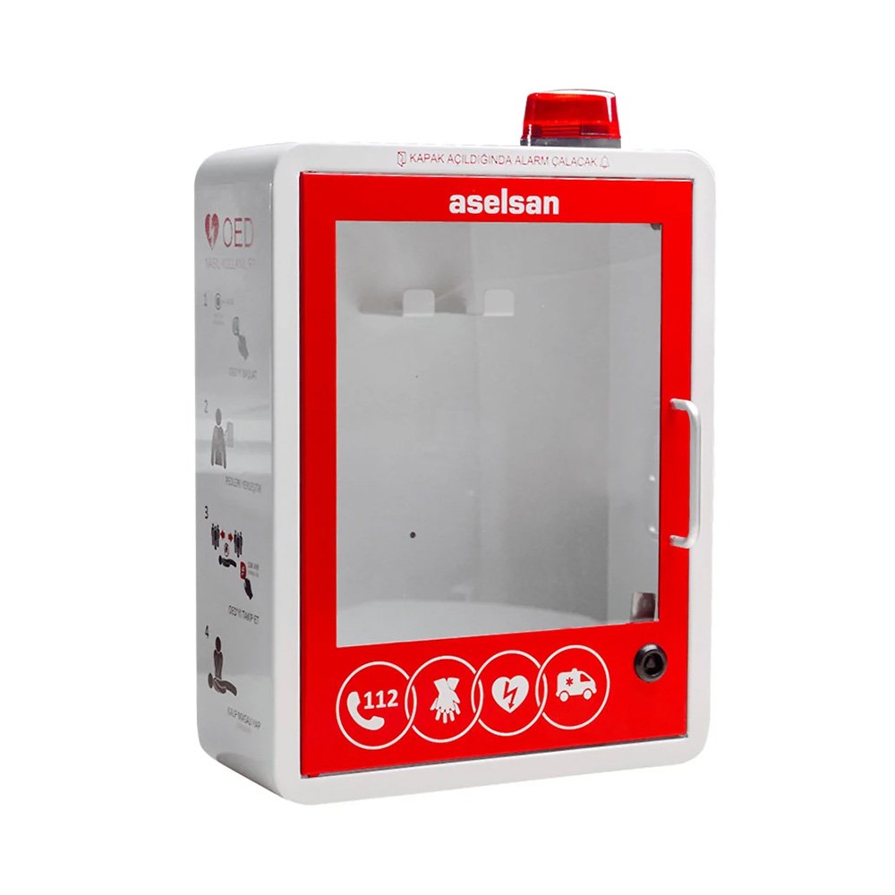 Heartline Otomatik Eksternal Defibrilatör için AlarmlıKabinet, metalden üretilmiş, duvara monte edilebilen, 80 desibel alarm seviyesive manyetik kapı mandalıyla kolay erişim sağlayan bir muhafaza çözümüdür.